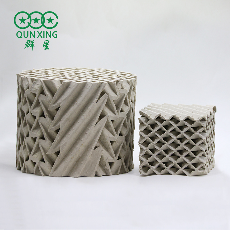 陶瓷波紋填料是一種新型規(guī)整填料,它是由許多具有相同幾何形狀的填料單元體組成。由于陶瓷的結(jié)構(gòu),具有良好的親水性能,其表面可形成極薄的液膜的湍動(dòng)及氣流的傾斜曲折通道能促進(jìn)氣流但又不阻擋氣流使陶瓷填料能與金屬填料相匹敵,而其耐腐蝕、耐高溫性能金屬填料卻無法相比。表面結(jié)構(gòu)有良好的濕潤(rùn)性能,能使液體加快流動(dòng)、使填料滯液量降至低。從而降低了過熱、聚合和結(jié)焦的機(jī)會(huì)。